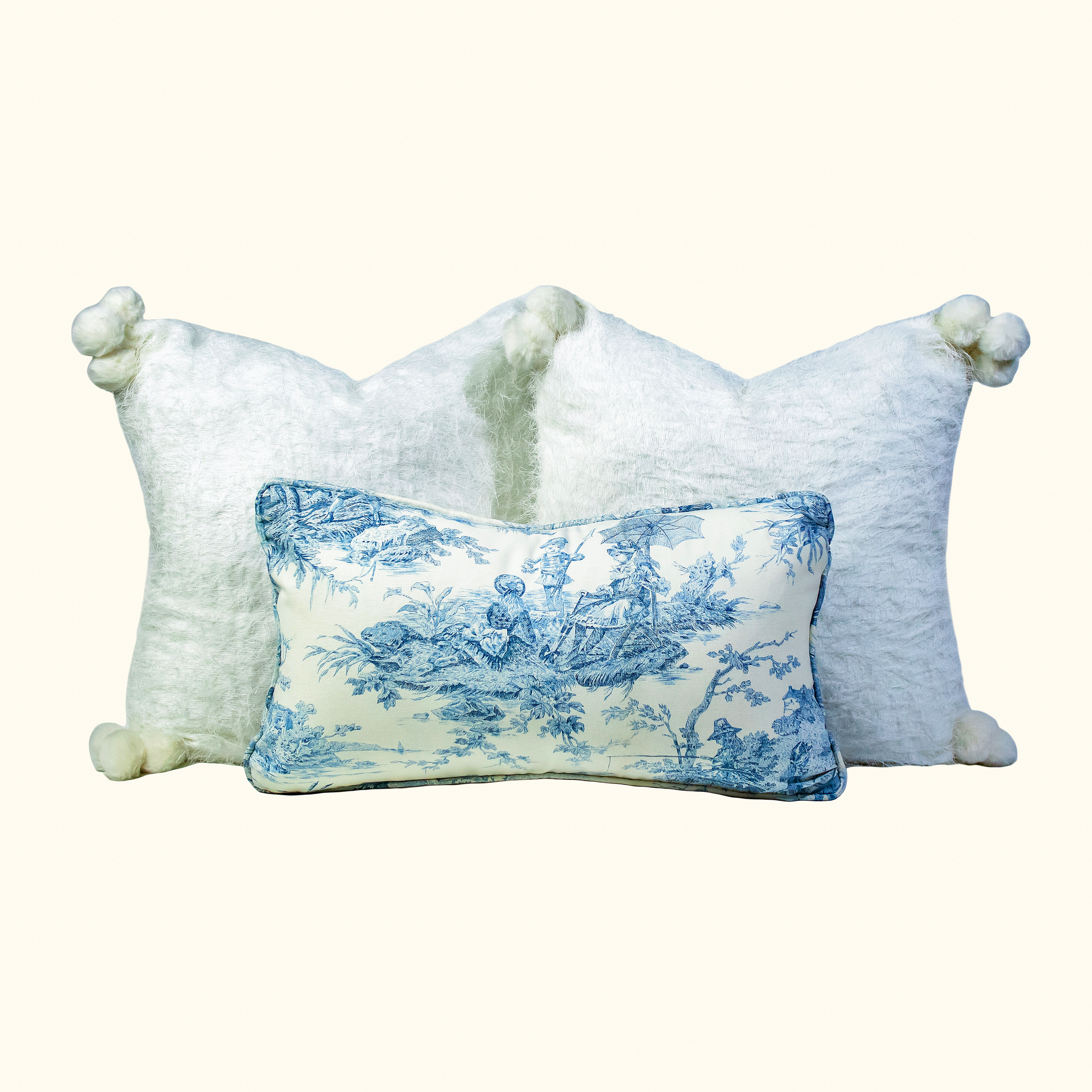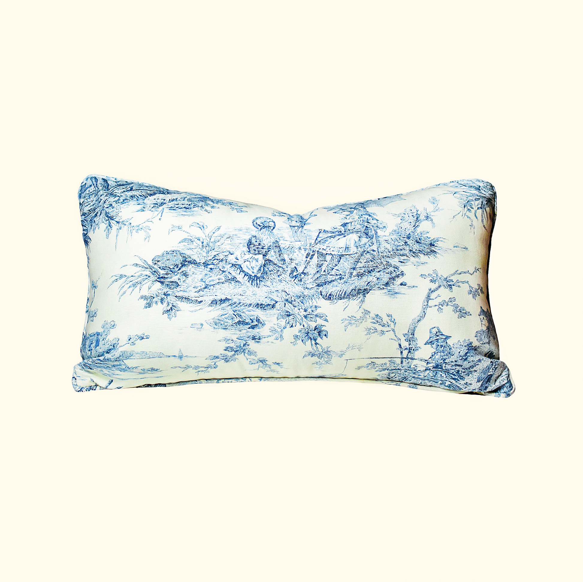 > Features a two-sided option for versatile styling. The front side showcases a toile de Jouy design, ideal as a main accent. The back is a beige linen, perfect for minimalist or understated decor.