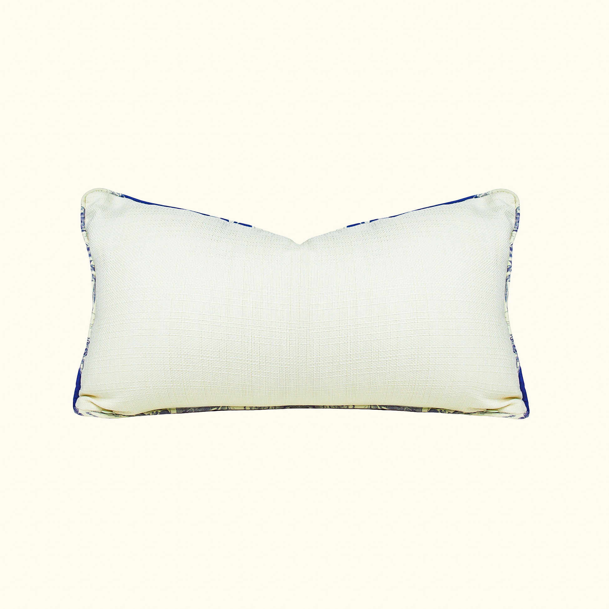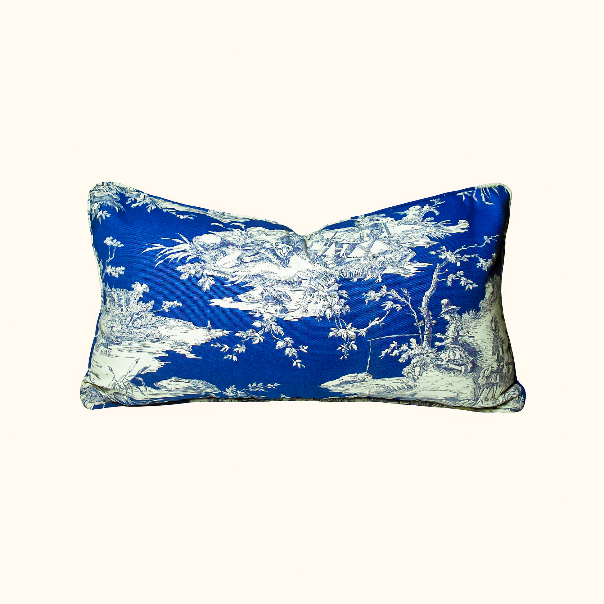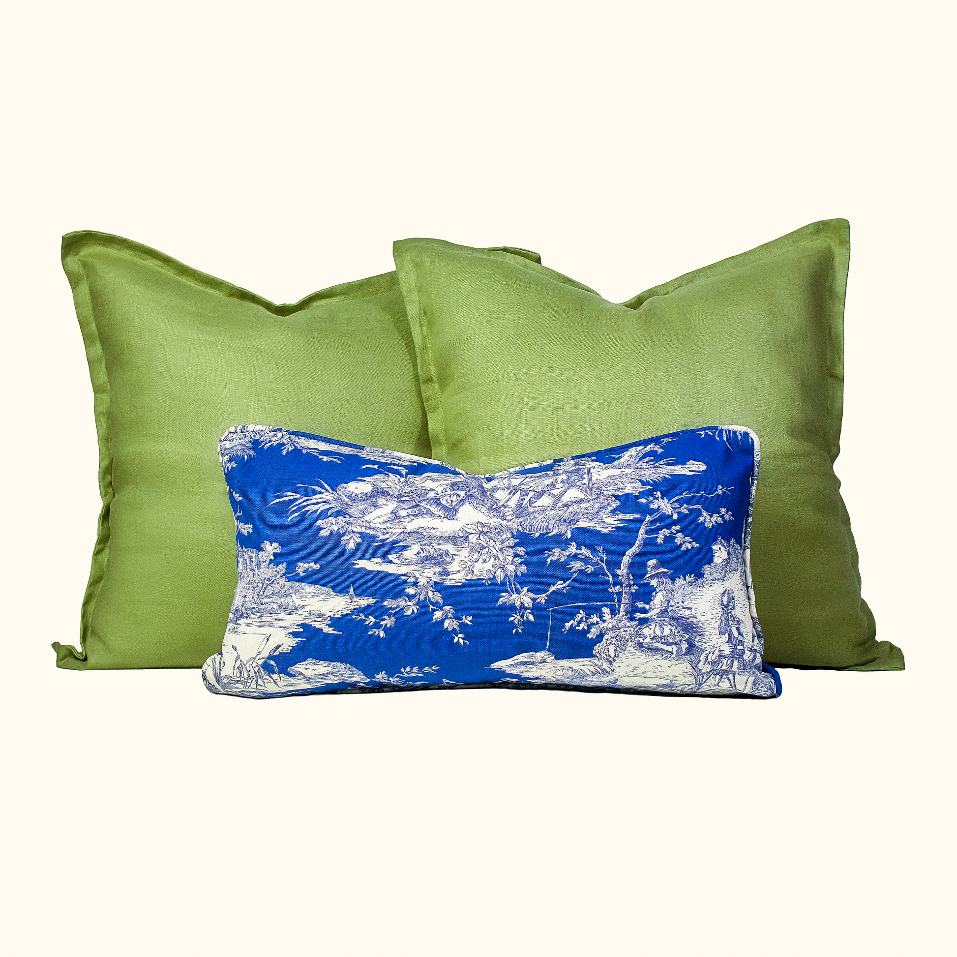 > Features a two-sided option for versatile styling. The front side showcases a toile de Jouy design, ideal as a main accent. The back is a beige linen, perfect for minimalist or understated decor.