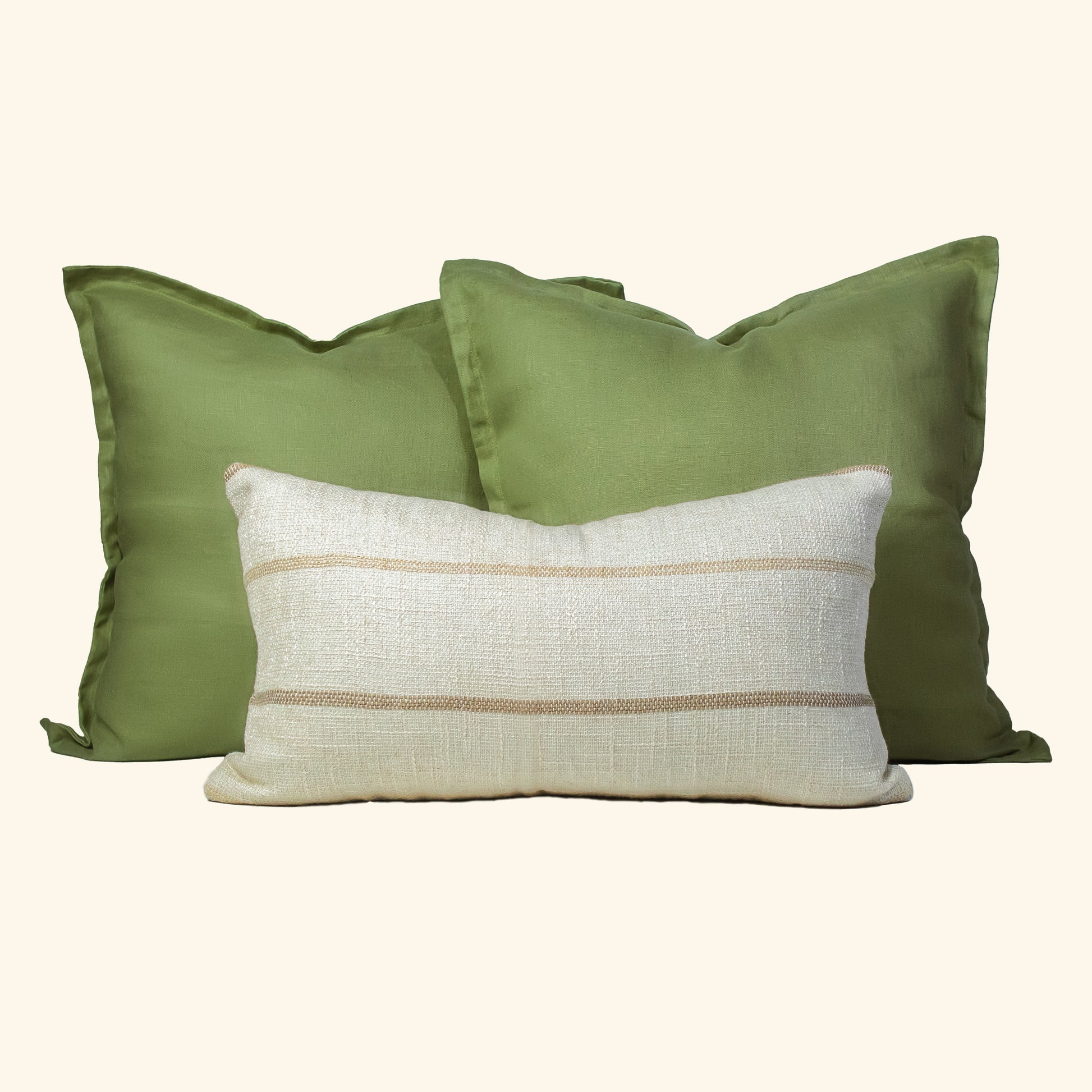 > Features a two-sided option for versatile styling. The front side showcases a toile de Jouy design, ideal as a main accent. The back is a beige linen, perfect for minimalist or understated decor.